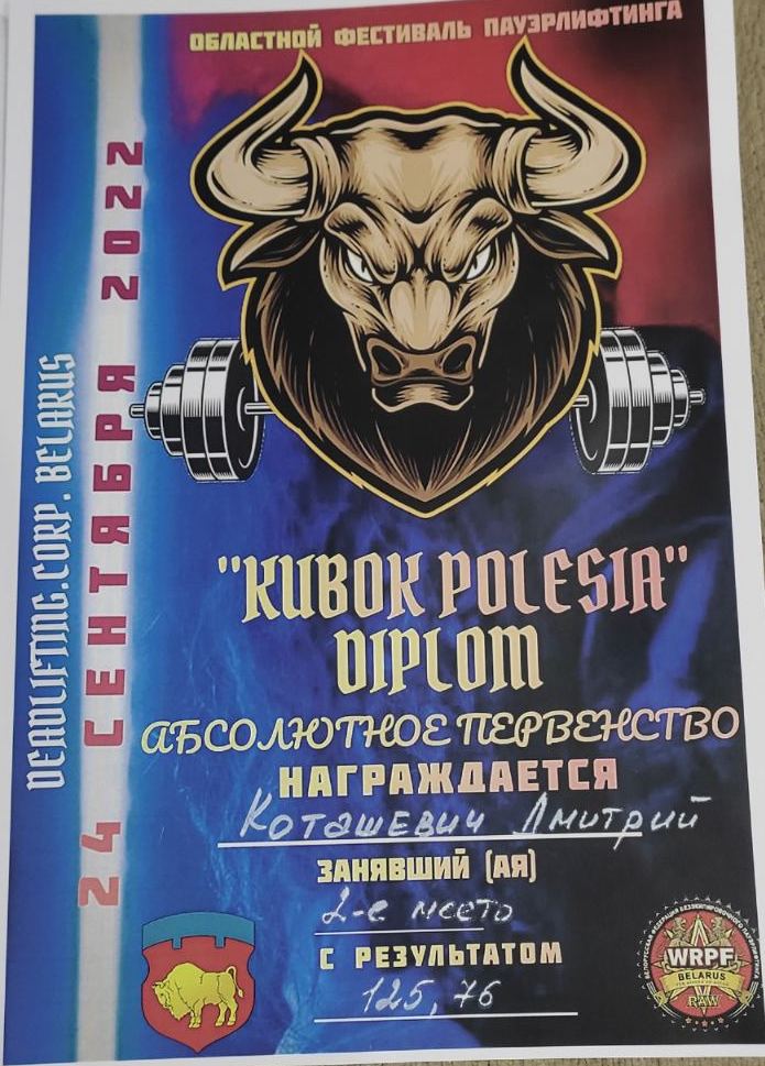По итогу Дмитрий занял первое место в своей весовой категории до 75 кг с результатом 175 кг, а также 2 место в абсолютной весовой категории. На этом турнире ему было вручено удостоверение мастера спорта международного класса (МСМК), выполненного им 22 мая 2022 года.